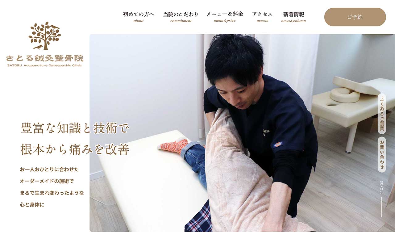 https://satoru-s.com大阪府寝屋川市の整骨院。ブラウンとベージュ、ホワイトを基調にしたスタイリッシュなホームページ。余白を広く使ったデザイン性の高い設計です。